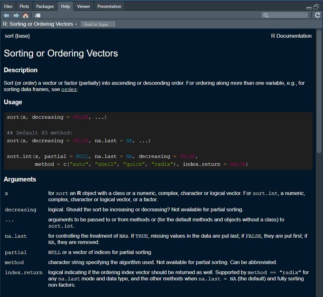 Let’s say I ask Google for an R function that sorts vectors and I find the sort() function!…But how do I know about its arguments? How do I know whether it sorts in ascending or descending order by default? How do I know that the function does what I need? 🤔