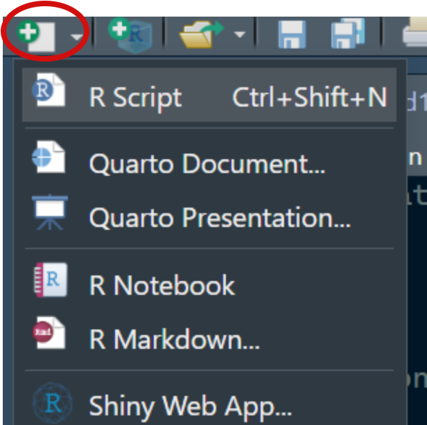 Before we can do any coding, we need to open a new R script! You can open a new R script by following the steps in the image on the right, or by using pressing Crtl + Shift + N (Windows) or Cmd + Shift + N.