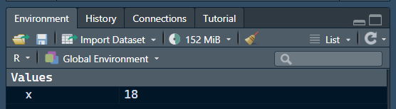 The x object that we just created is a numeric vector (type of object) of length 1 🤔