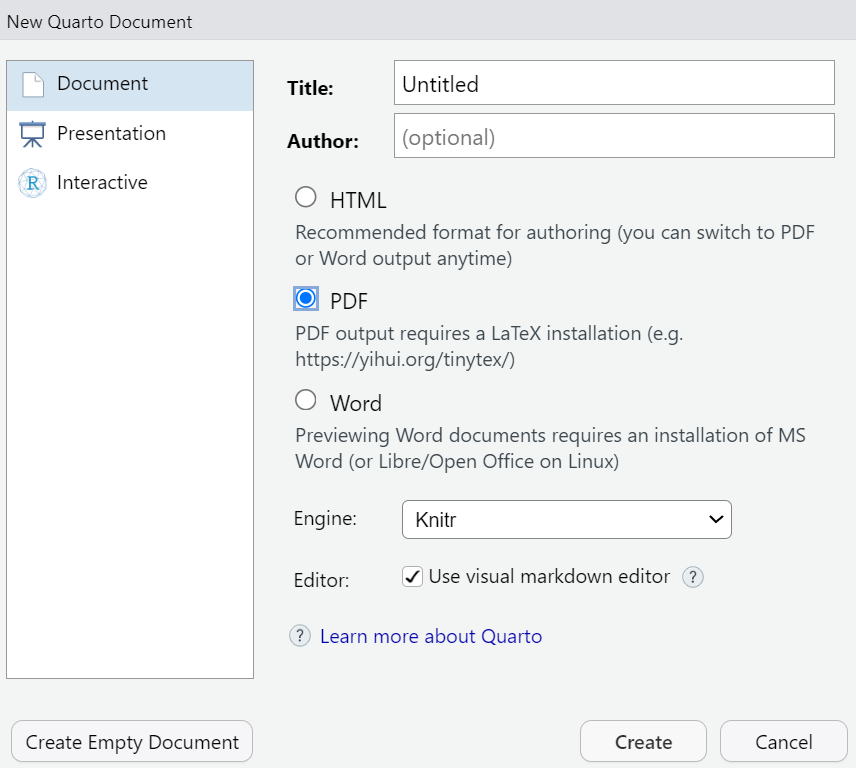 quarto files have the .qmd extension. We can open a .qmd file by clicking file → new file → quarto document. You should see the window on right appear. Make sure you select PDF.