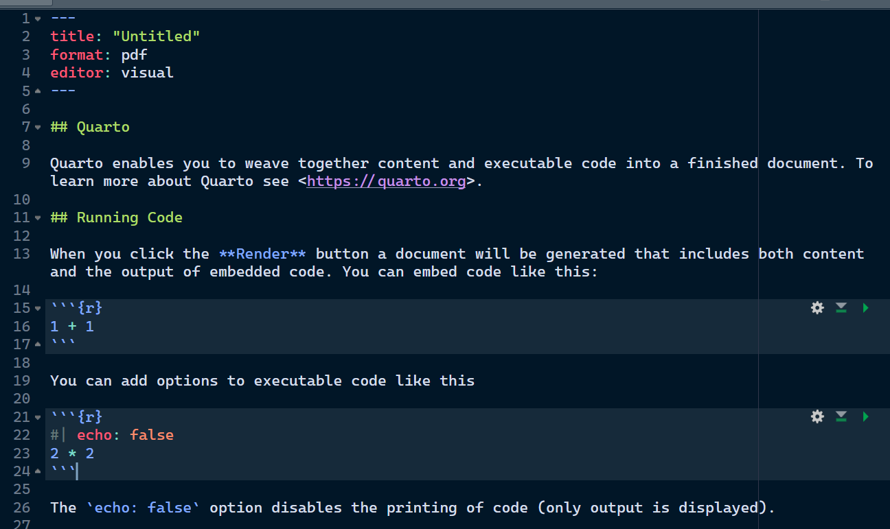 The fist thing that we see in the .qmd file is the are some lines enclosed between two ---. That is a YAML header. The YAML header simply gives quarto some instruction to follow once you click the “Render” button.