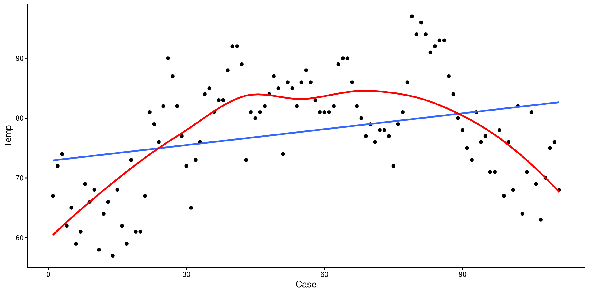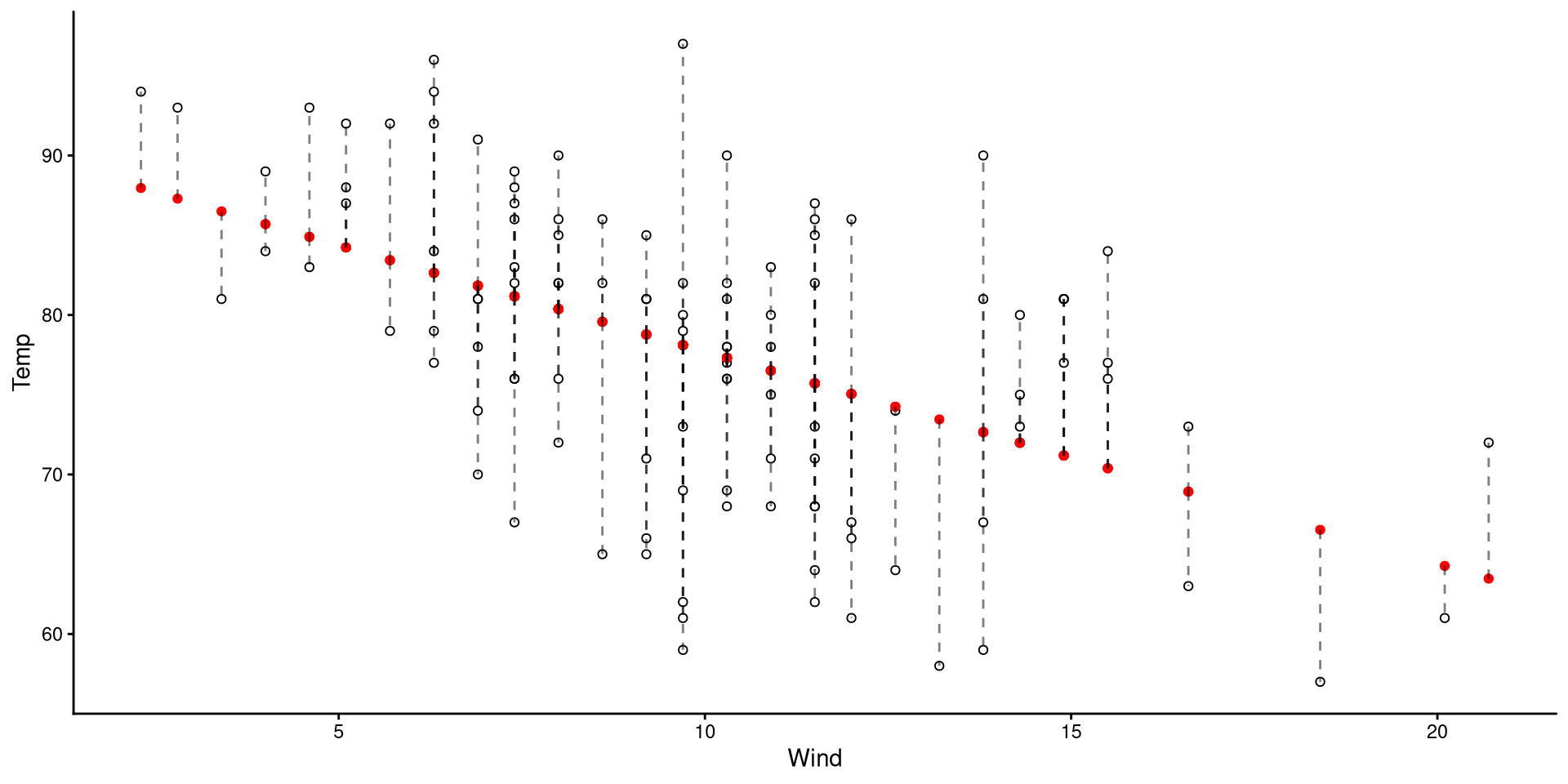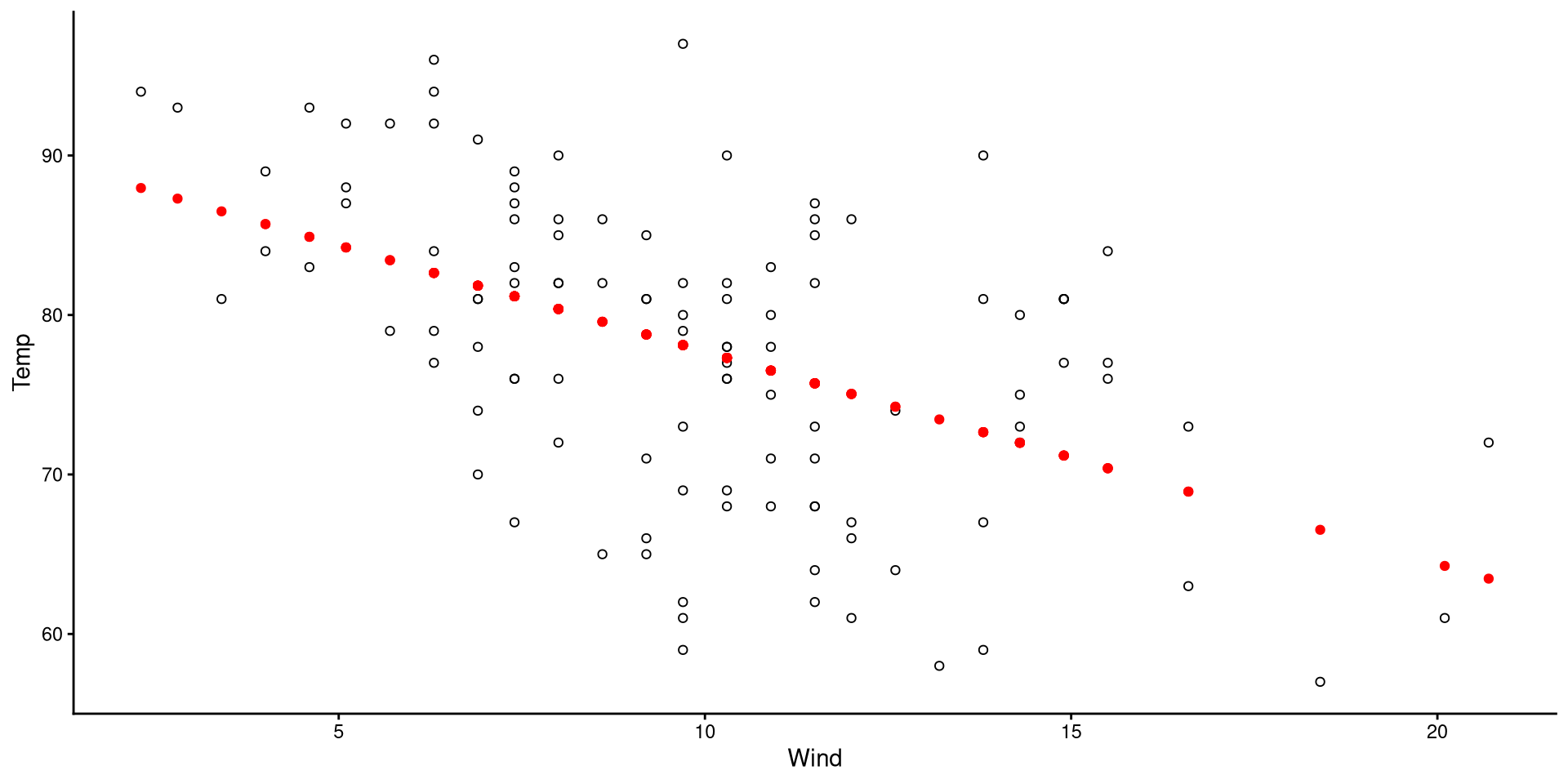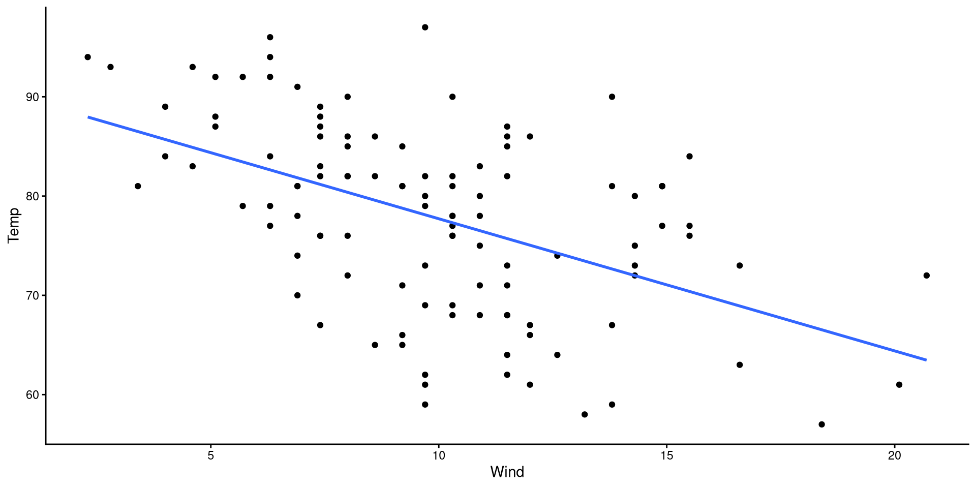 We will be using wind speed (Wind) to predict temperature (Temp). First let’s take a look at these two variables: