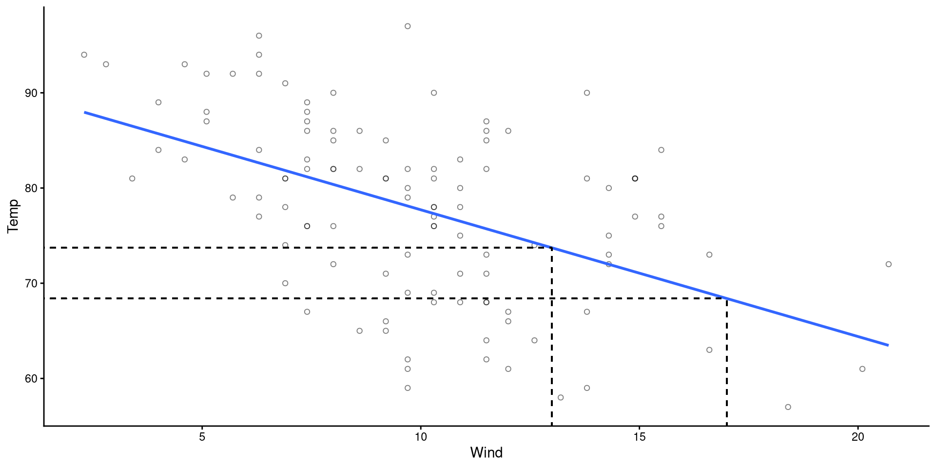 Wind, we expect Temp to decrease by \(1.33\) degrees Fahrenheit.