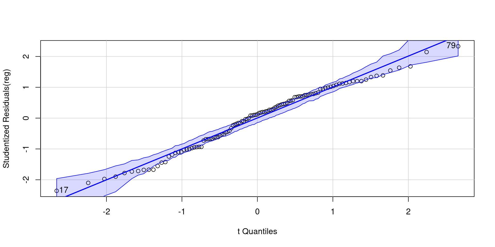 As long as roughly 95% of the residuals (dots) are within the band, there should be no cause for concern.