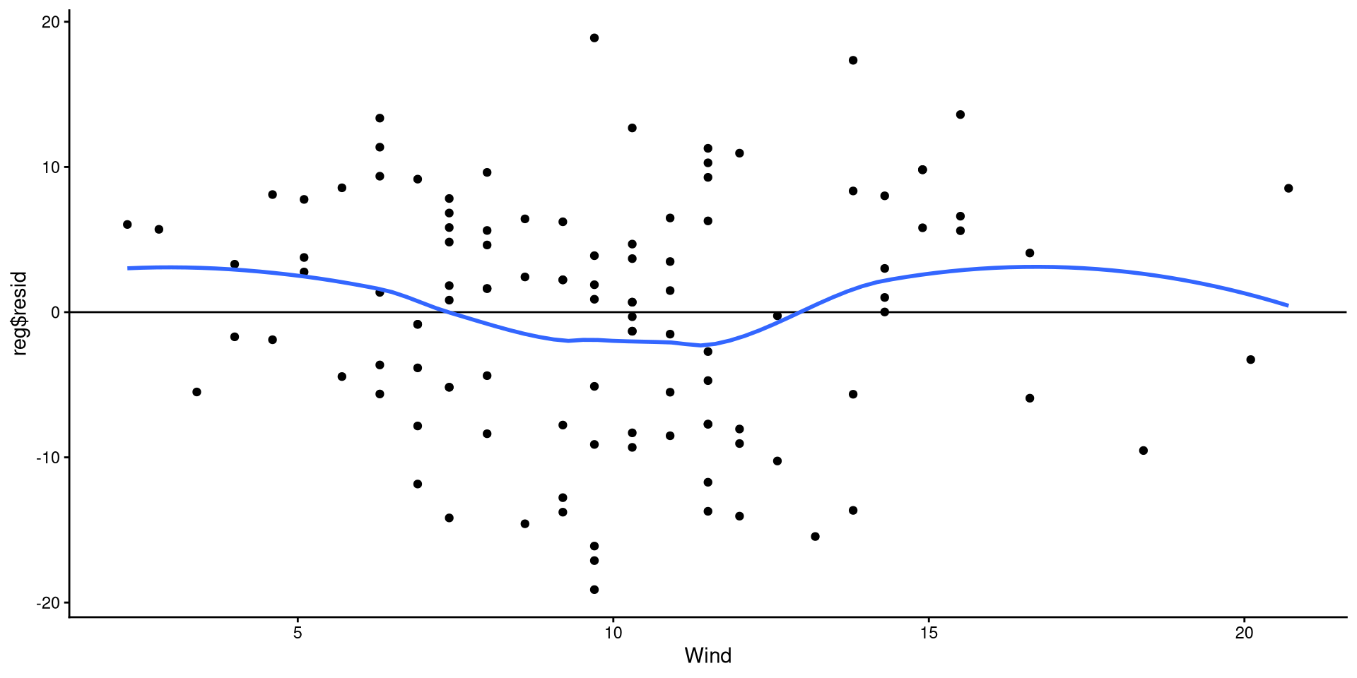 NOTE: if we were to just run lm(Temp ~ Wind), we would get an error. Neither Temp and Wind are objects in our R environment. We need to tell R where to find Temp and Wind by adding data = dat.