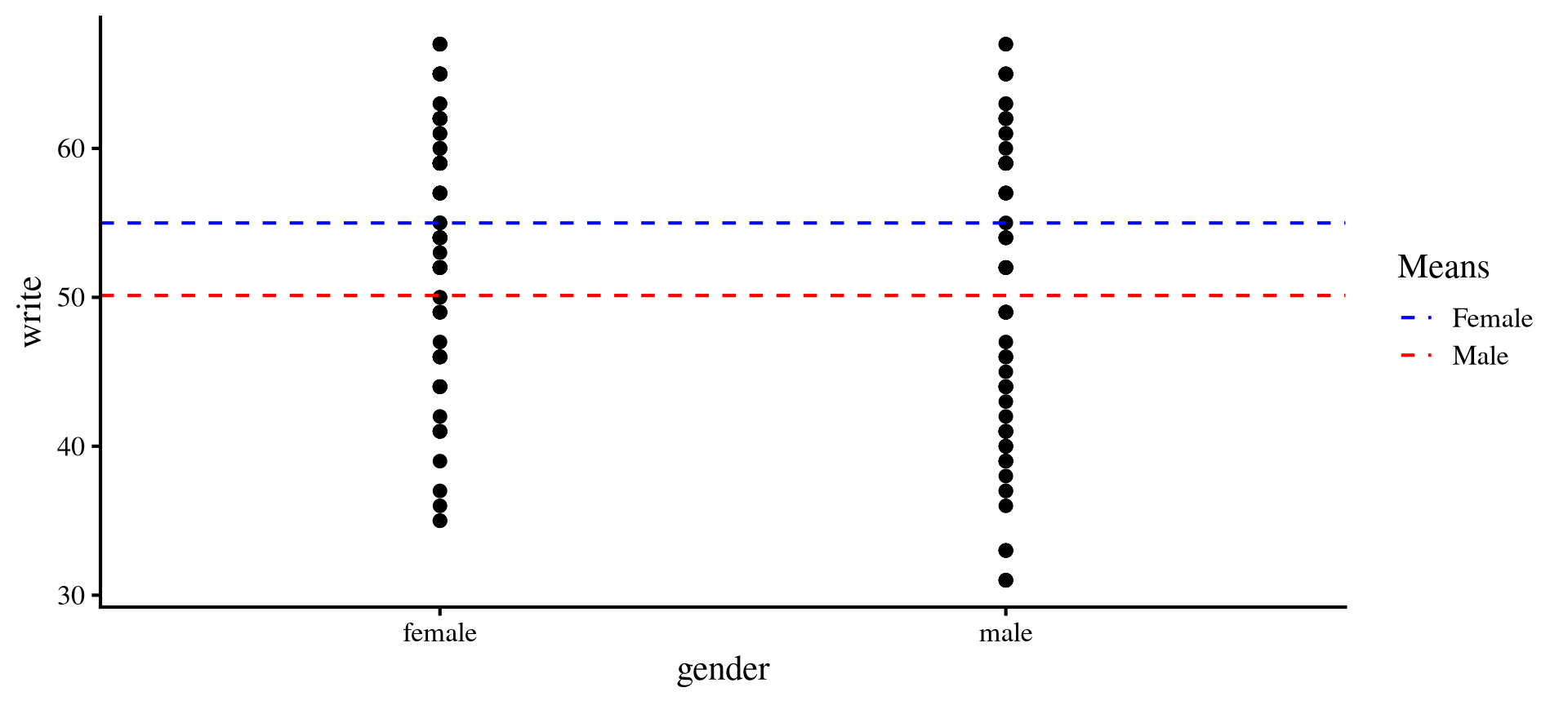 • \(54.99\) is the expected mean write score of females (which is coded as \(0\)).