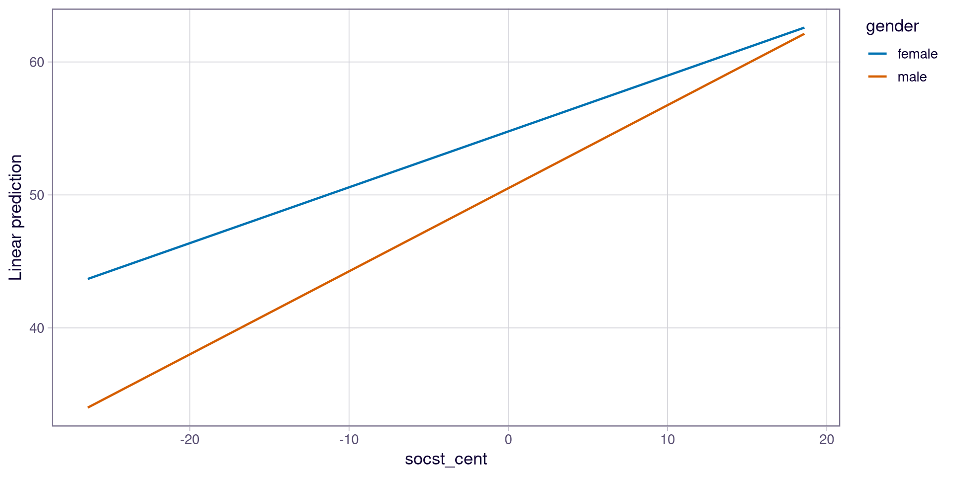 Then we pass the regression object (reg_int), and use ~socst_cent*gender to tell the function that we want the means of each level of gender by the specified values of socst_cent: